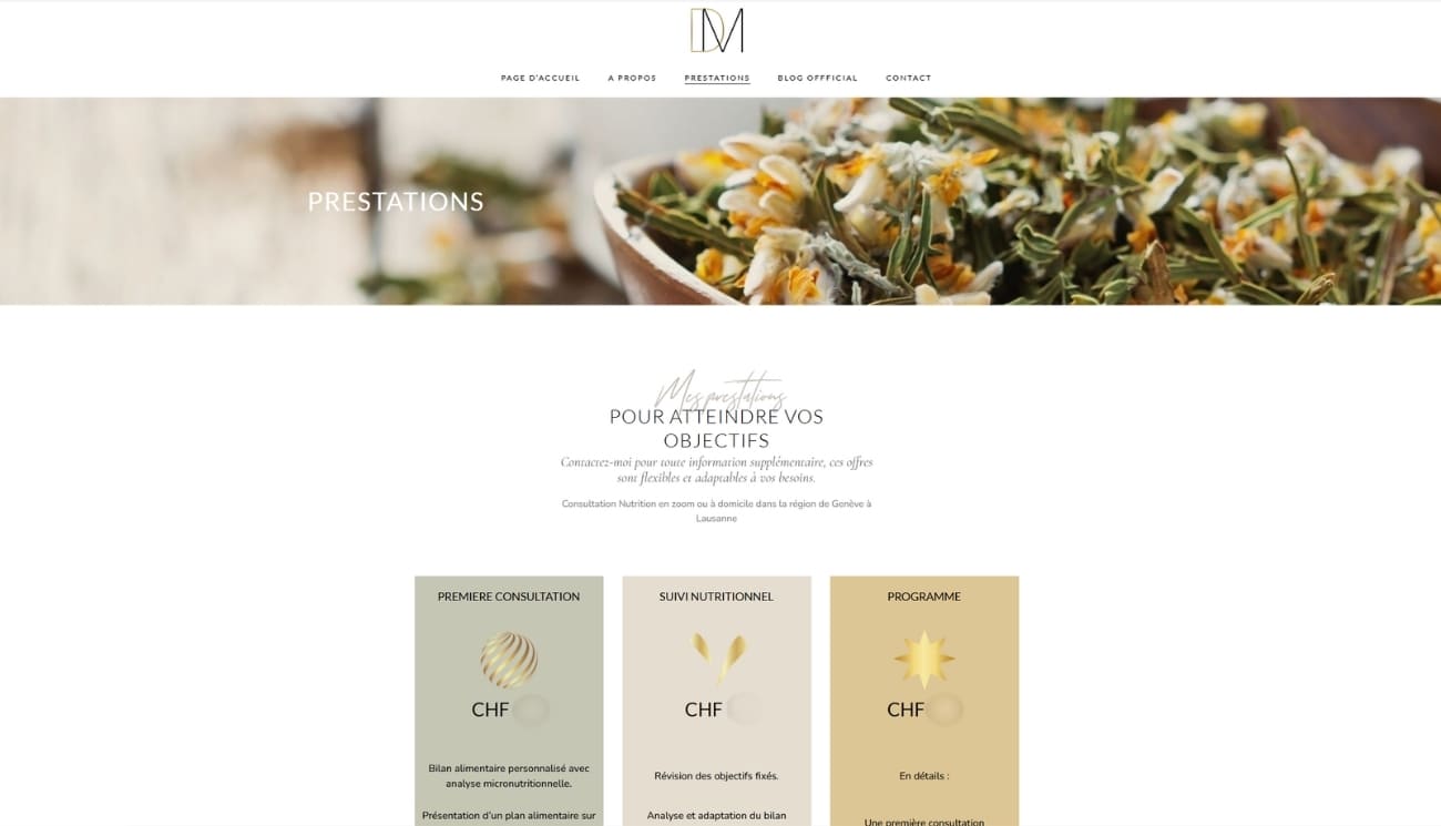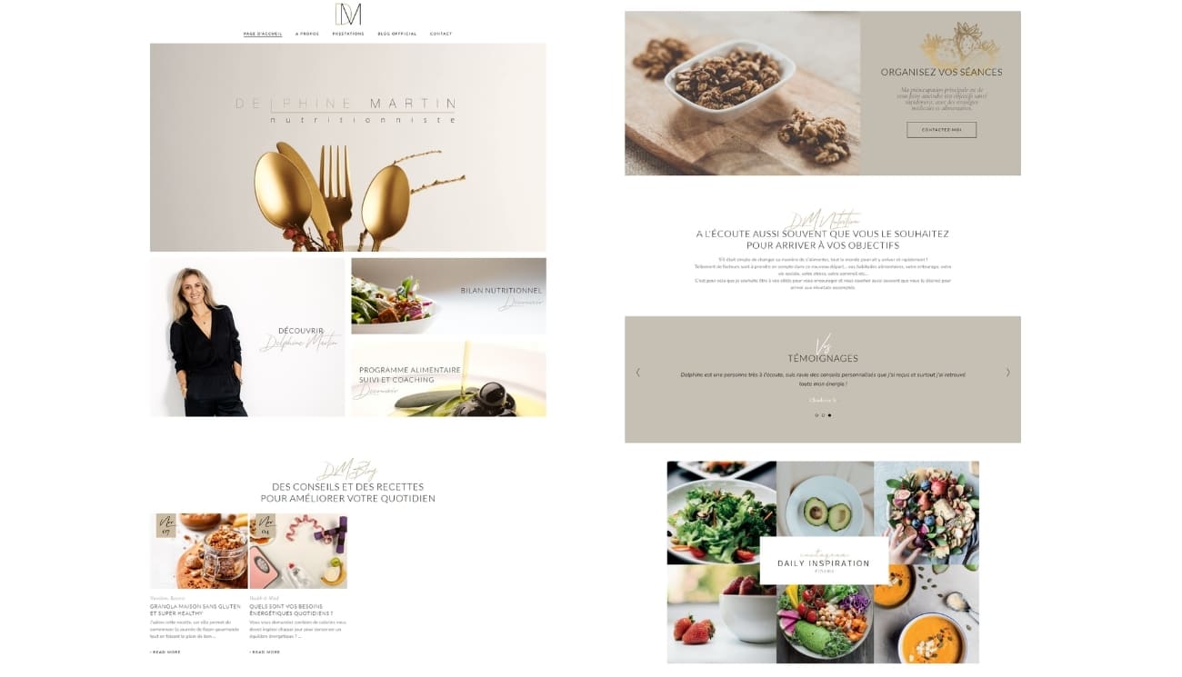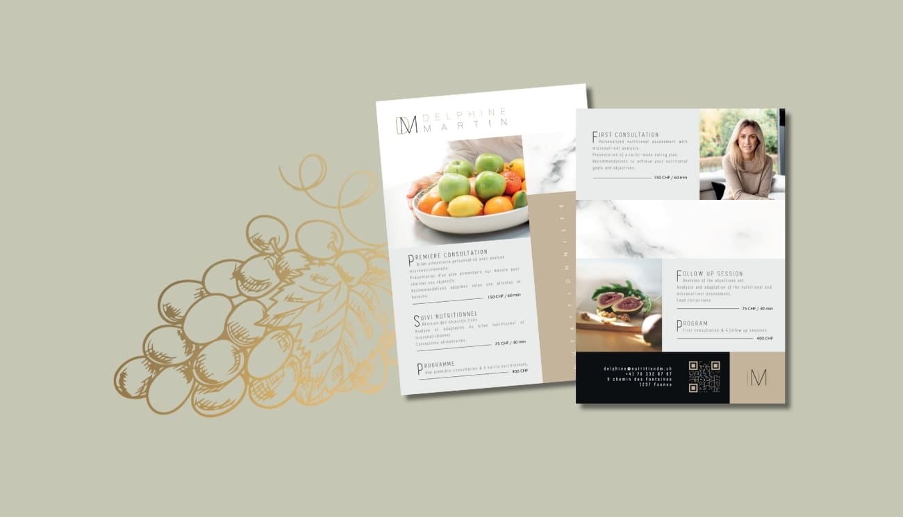Nous avons eu le plaisir d’accompagner Delphine, fondatrice de DM Nutrition, nutritionniste passionnée dédiée au bien-être et à l’équilibre de vie. Son souhait : une identité visuelle épurée, minimaliste et contemporaine. Nous avons créé un univers graphique sur mesure, aux tons élégants, inspirés de l'industrie du luxe et de la sobriété haut de gamme. En parallèle, la conception de son site internet a permis de retranscrire une expérience digitale fluide, moderne et harmonieuse, fidèle aux valeurs de DM Nutrition.