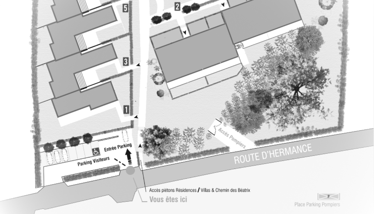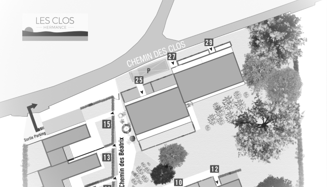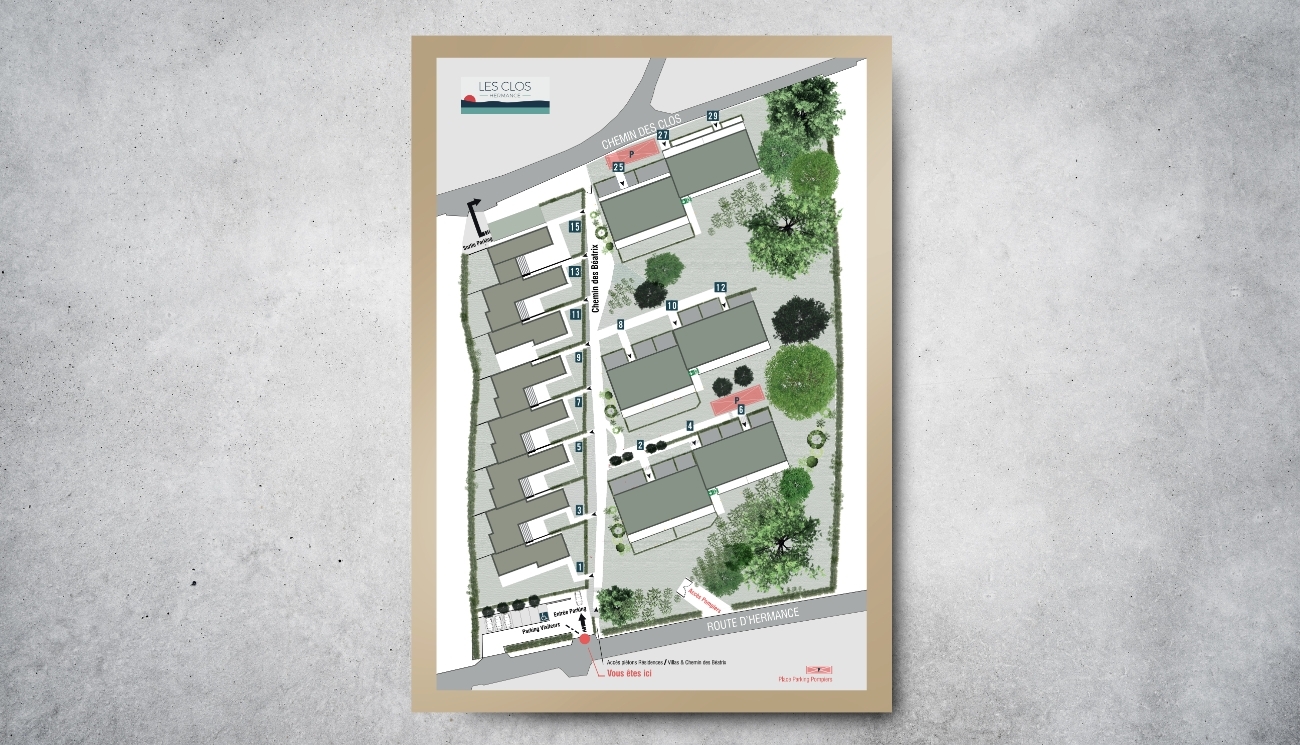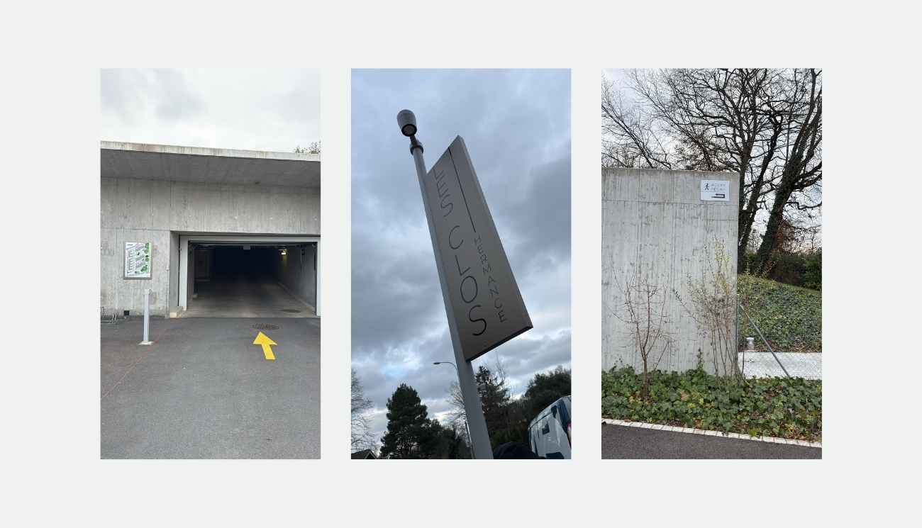 Afin de prolonger l’élégance et la cohérence architecturale du lieu, nous avons conçu une signalétique sur mesure pour la zone de stationnement visiteurs. Les panneaux directionnels, inspirés du plan du domaine, se distinguent par un design minimaliste et raffiné, en parfaite harmonie avec l’architecture du Clos d’Hermance. Alliant lisibilité, sobriété et intégration paysagère, cette signalétique assure une orientation fluide pour les visiteurs tout en s’inscrivant naturellement dans le décor et en étant visible depuis la route principale.